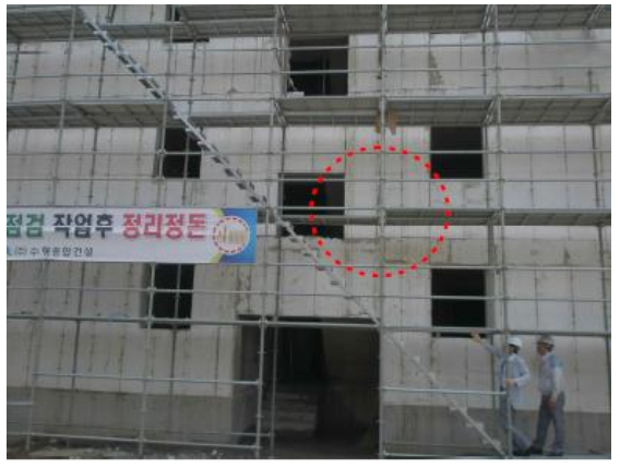 (5) 벽 연결재 설치간격은 아래 벽연결재설치 사진과 같이 제조사가 정한 기준에 따라 반드시 설 치하여야 한다. 벽 연결재는 수직재와 수평재의 교차부에서 비계 면에 대하여 직 각이 되도록 영구구조물에 연결하여야 한다.