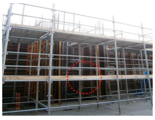 (3) 받침철물 설치한 다음 수직재를 설치하면 넘어짐의 위험이 있으므로 아래 사진과 같이 수평재를 이용하여 연결핀을 견고하게 설치하여야 한다.