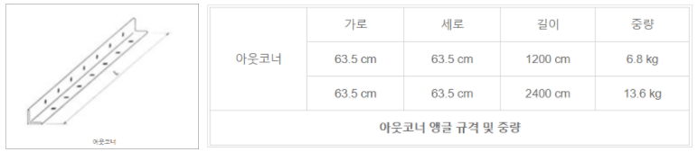 아웃코너는 유로폼을 세울때 콘크리트가 새지 않도록 벽체 모서리 바깥쪽 코너, 인코너는 안쪽 코너에 설치하여 사용하는 구조물입니다. 인코너, 아웃코너는 유로폼과 유로폼 사이를 연결할때 사용하는 자재이며, 유로폼의 길이에 따라 알맞은 사이즈를 사용할수 있습니다.